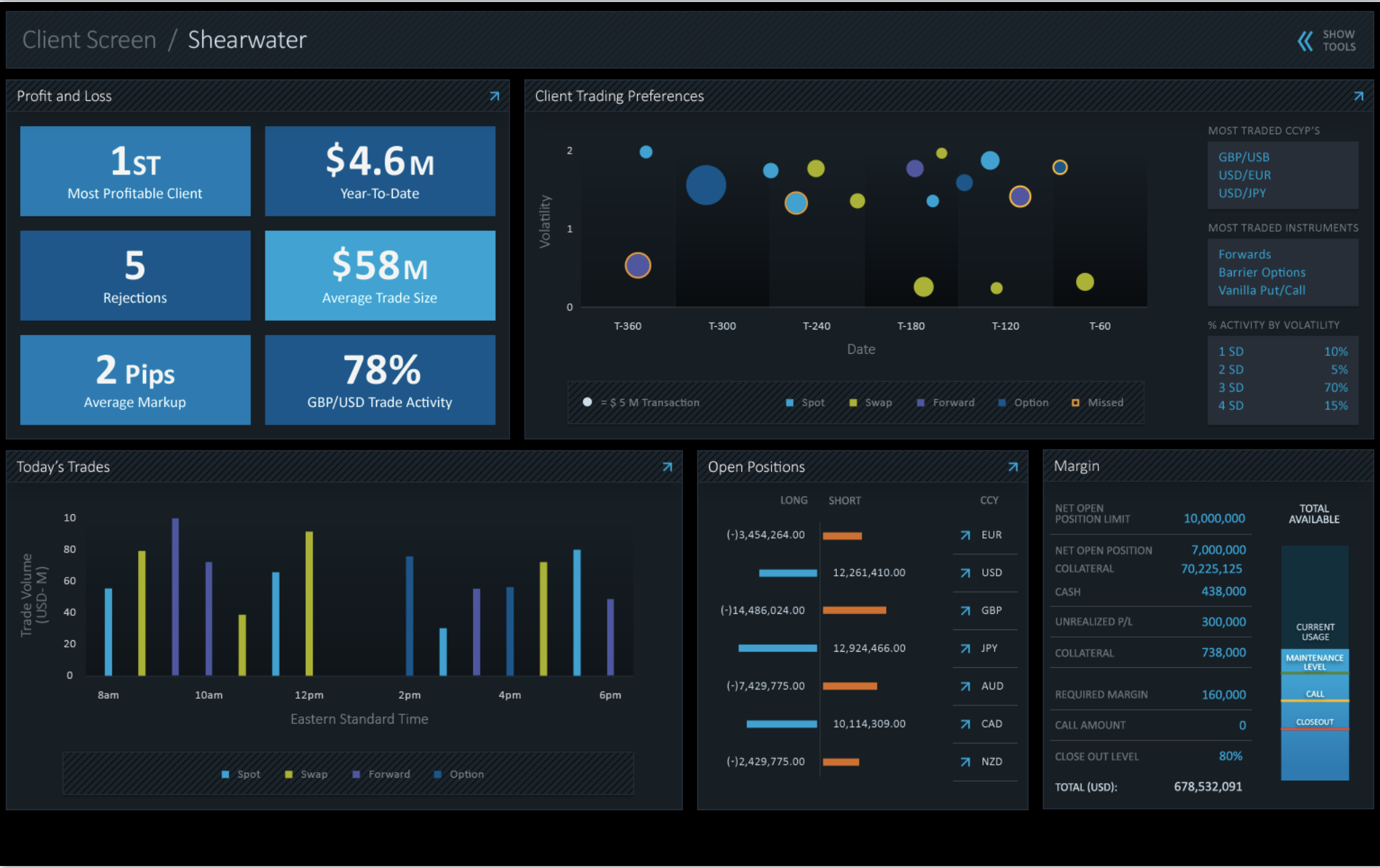 “Sales traders need to be able to summon summaries of different types of information (margin numbers, position numbers, P/L numbers) quickly and in the same view while they have their clients on the phone. Sales traders also need the ability to display their data in different sizes: full screen on a desktop and as small windows on a desktop. Mobile when they’re on the go.”