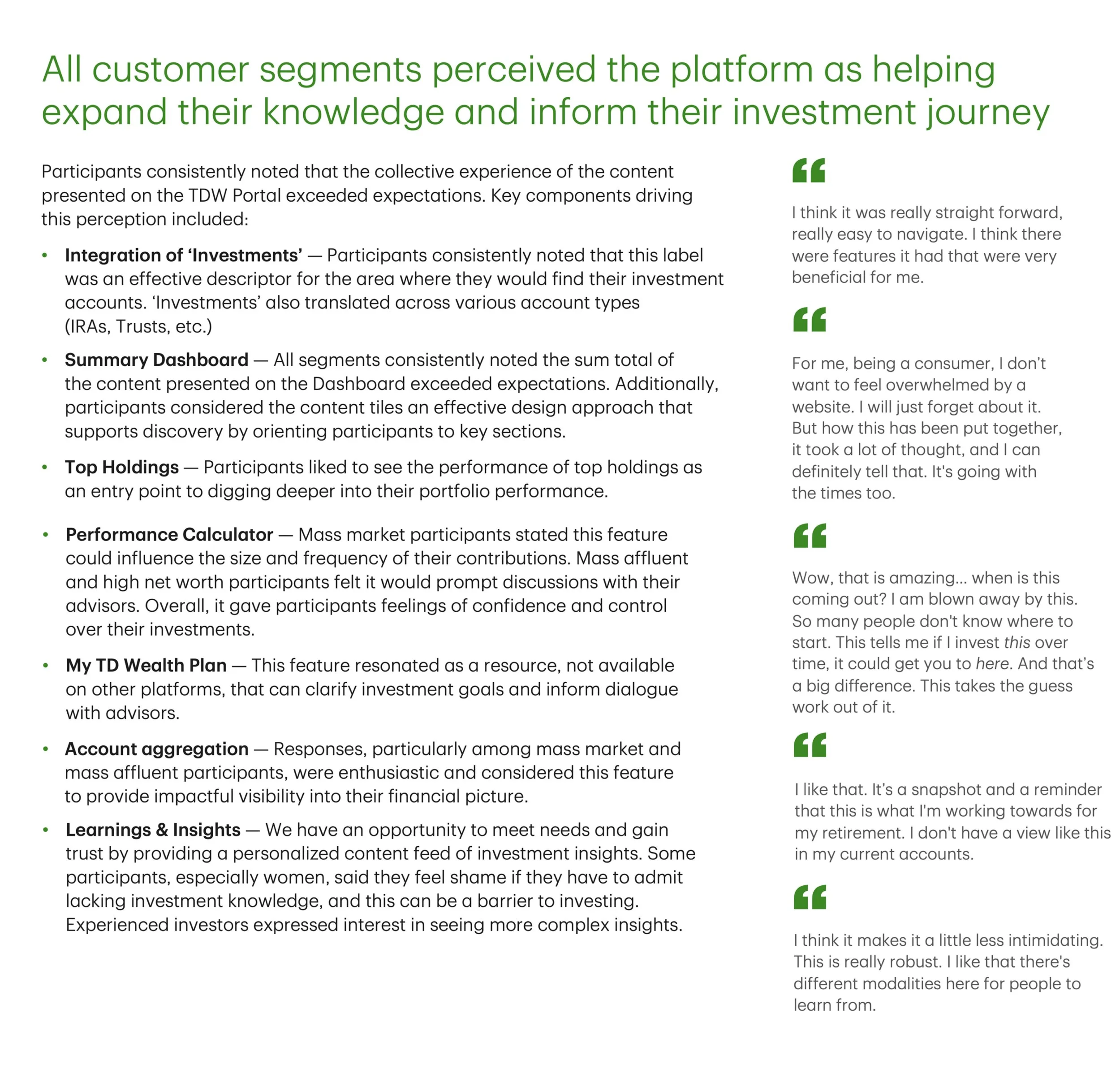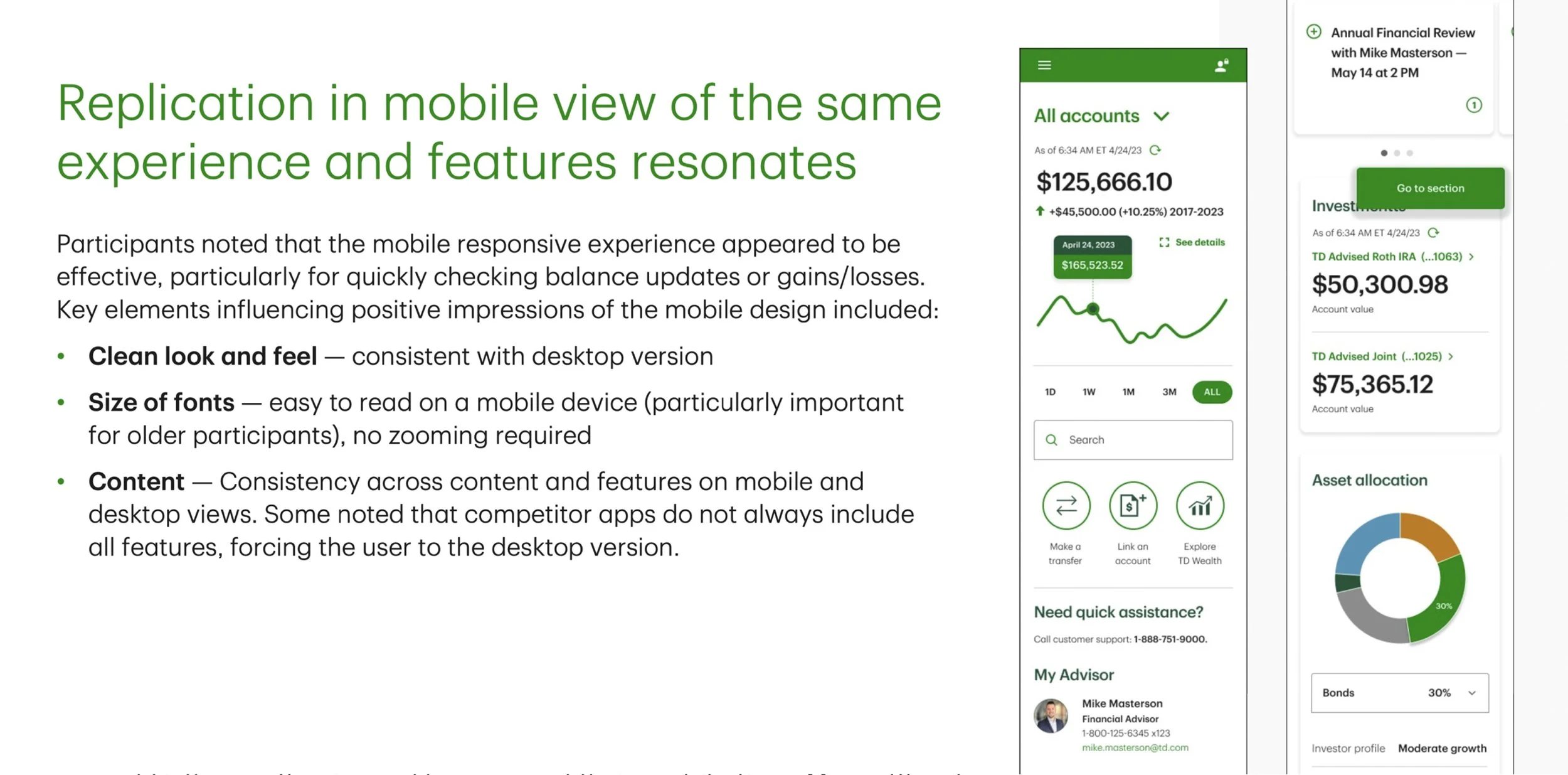 The experience should be easy to navigate, serving data-rich information that’s findable and digestible. It should feel like a TD customer first experience.