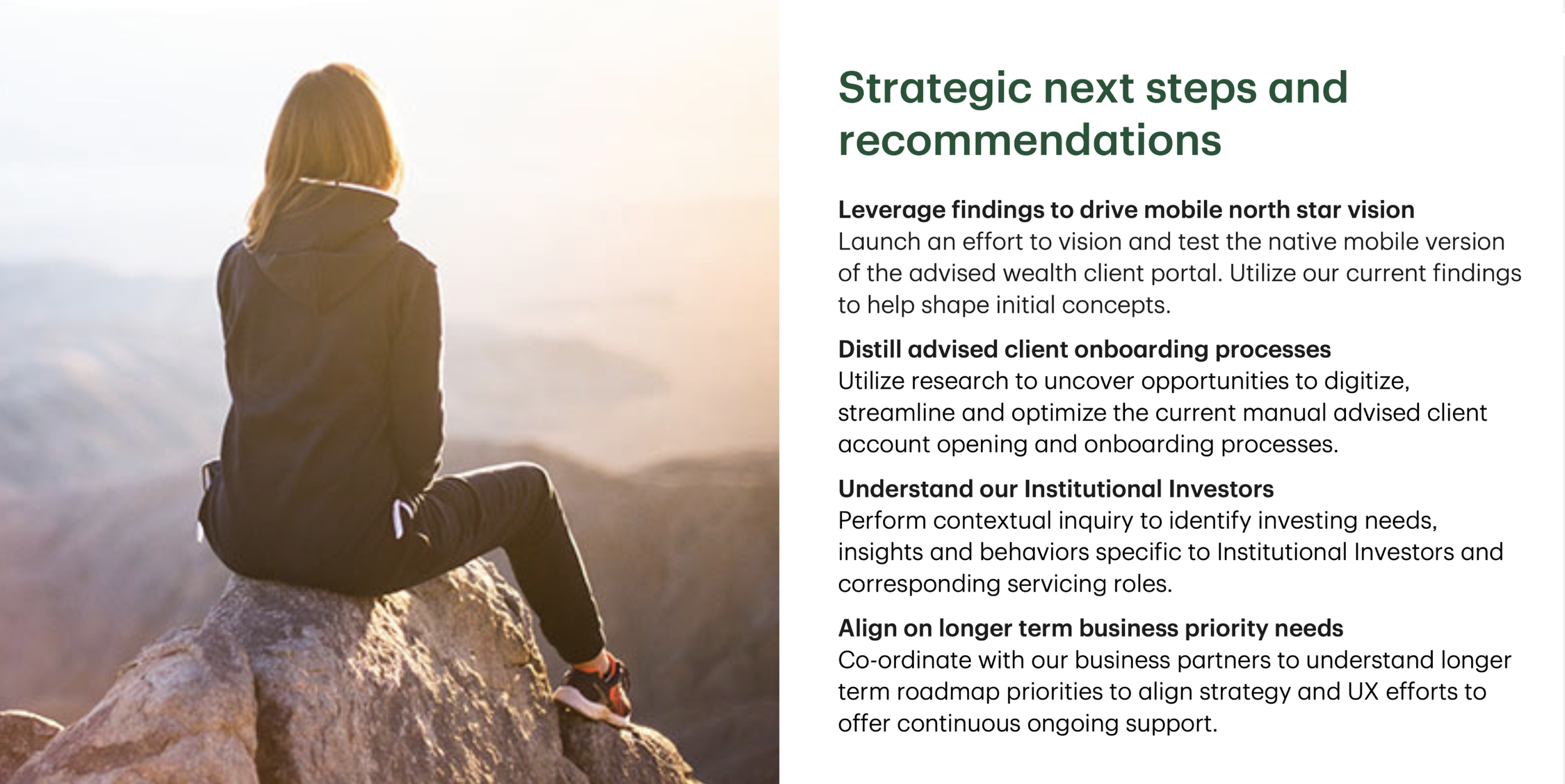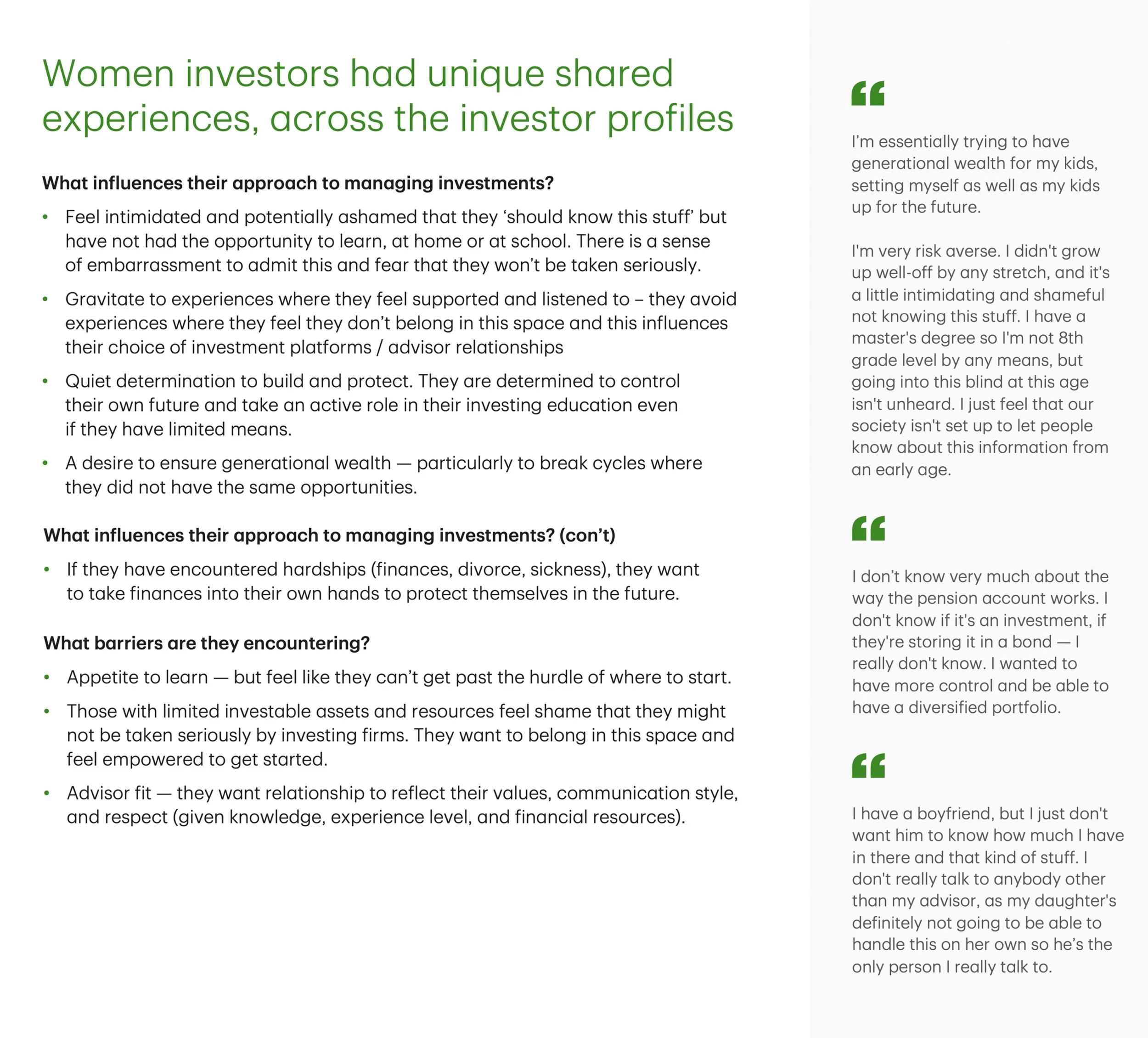 During our research phase, themes around women in investing emerged, which helped to shape a sister strategic initiative at the bank to continue exploring this market. Women, in particular, are under represented in the investment landscape, but tend to gravitate toward investment advice and wanted relationships with their advisors that could evolve over the course of their lifetimes. In a McKinsey study on women in US wealth management, up to 70% of women switch advisor relationships within 1 year of their partner dying. Women, generally, are looking for an advisor that feels like more of a personal relationship to them. With women set to inherit and command increasing rates of household wealth, how could TD better position itself to serve this market?
